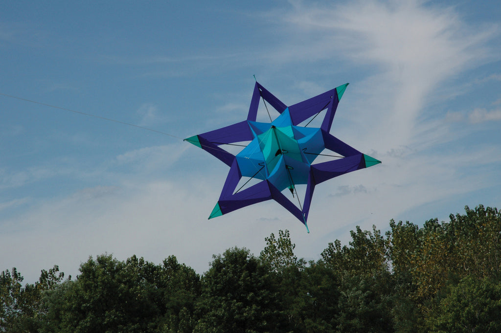 An accomplished chemist by background, Kathy Goodwind's exceptional understanding of structure and design is the backdrop for one of her most famous designs, The Super Nova. Beautifully made with scalloped edges, well placed reinforcements and a drum tight sail this wonder will satisfy any serious kite enthusiast.