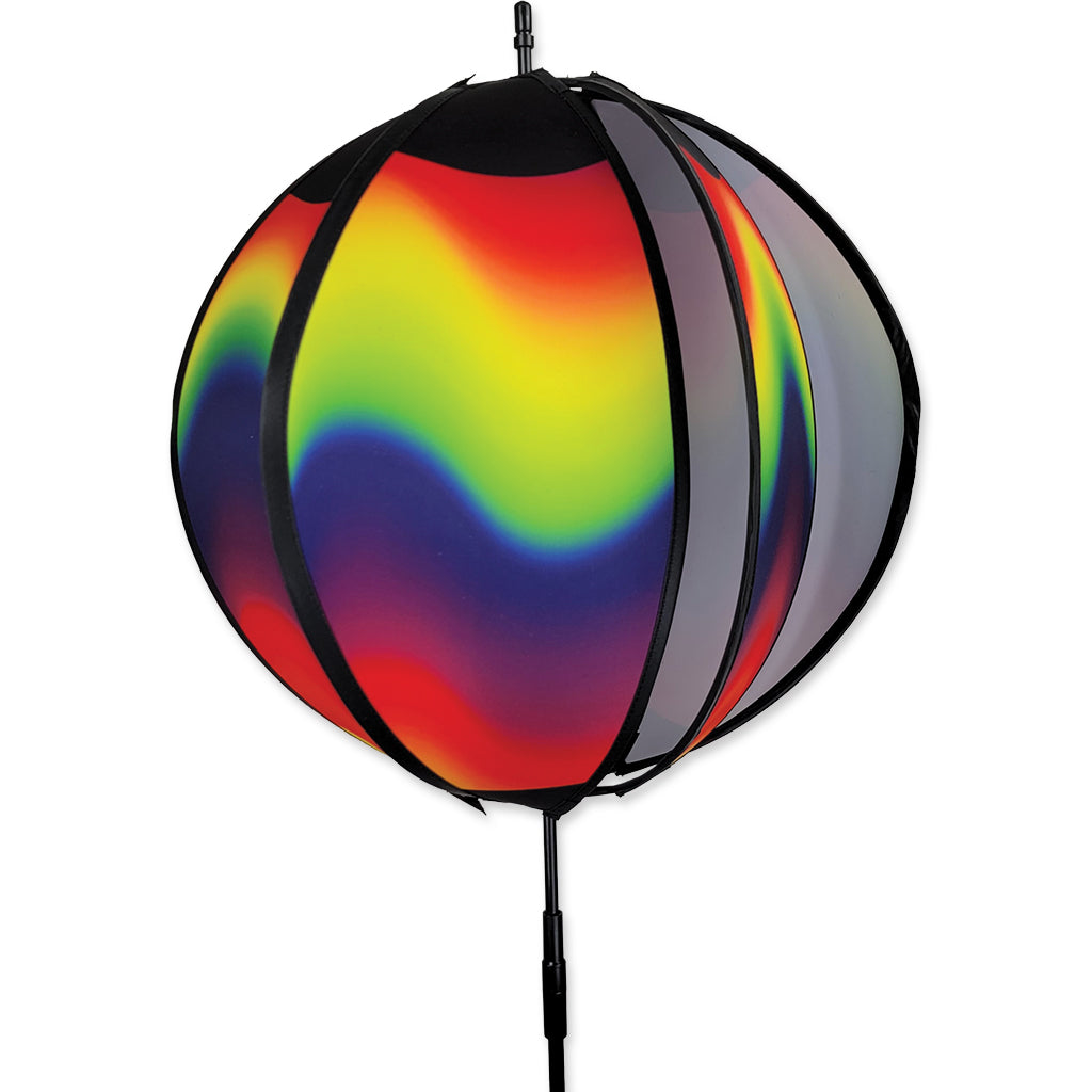 Single ball spinner with six colorful panels featuring a colorful rainbow wavy gradient pattern. Includes ground stake.