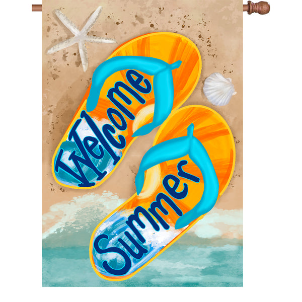 Flag shows two flip flops on the sand and reads: Summer Welcome