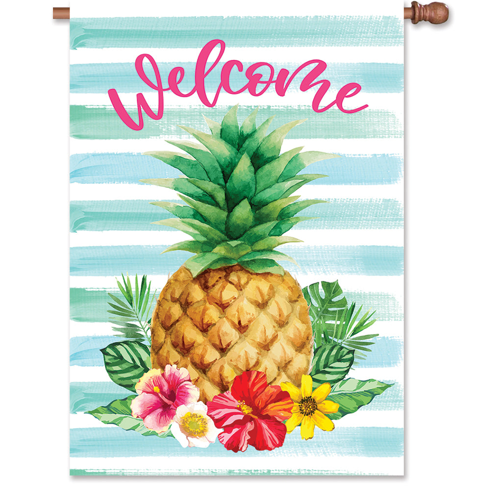 Flag shows a pineapple, hibiscus flowers and reads: Welcome
